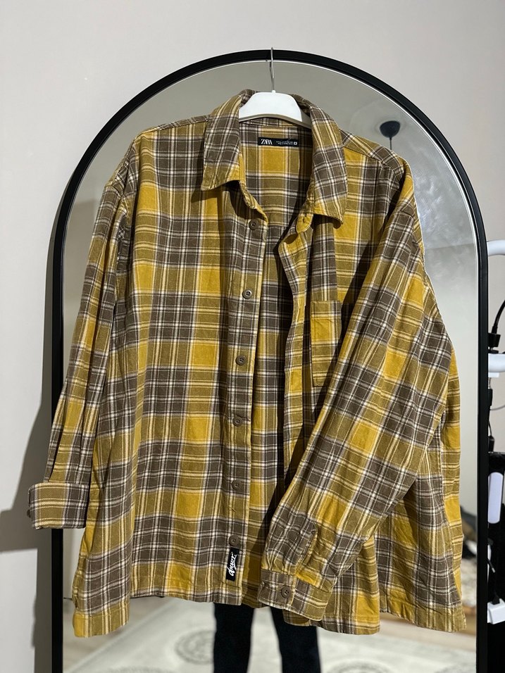 Sarı ve gri kareli keten kumaştan, düğmeli ve yakalı, bol kesim uzun kollu gömlek. Rahat sokak stili için uygundur. Hiç kullanılmamıştır boyu 75 cmdir defosu yoktur