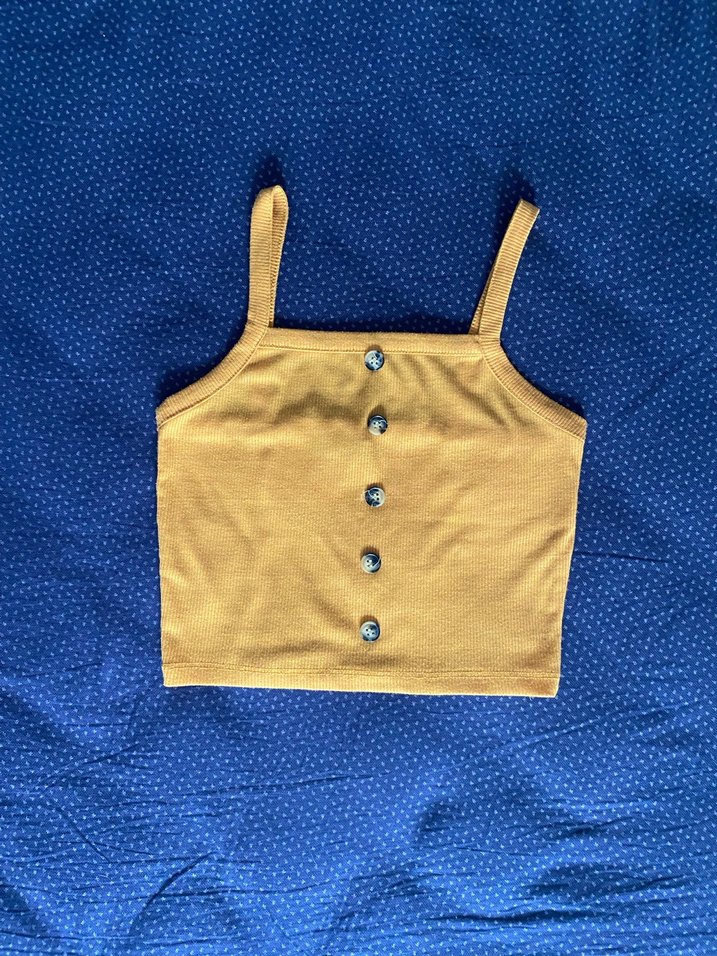 Yumuşak sentetik kumaştan, ince askılı, düğmeli ve sarı renkte, günlük kullanım için uygun dar kesim kadın atlet.