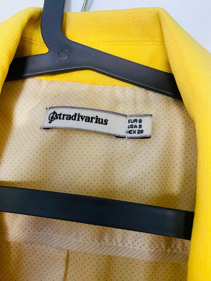 Düğmeli, kesik yakalı sarı kadın ceket. Sentetik kumaştan, normal uzunlukta, askılı kollu ve baskılı desene sahip, günlük sokak tarzı için uygun. ✨