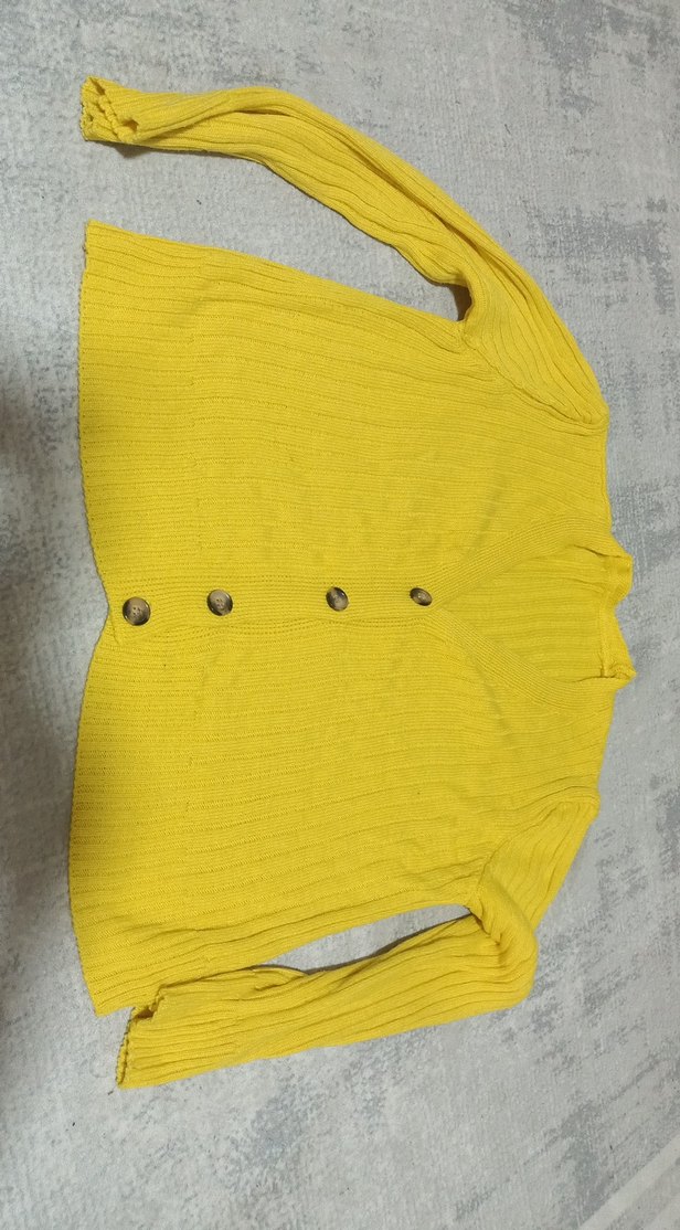 Düğmeli, uzun kollu, V yaka sarı kadın kazak. Normal midi boyda, yumuşak sentetik kumaştan, günlük kullanım için uygundur.