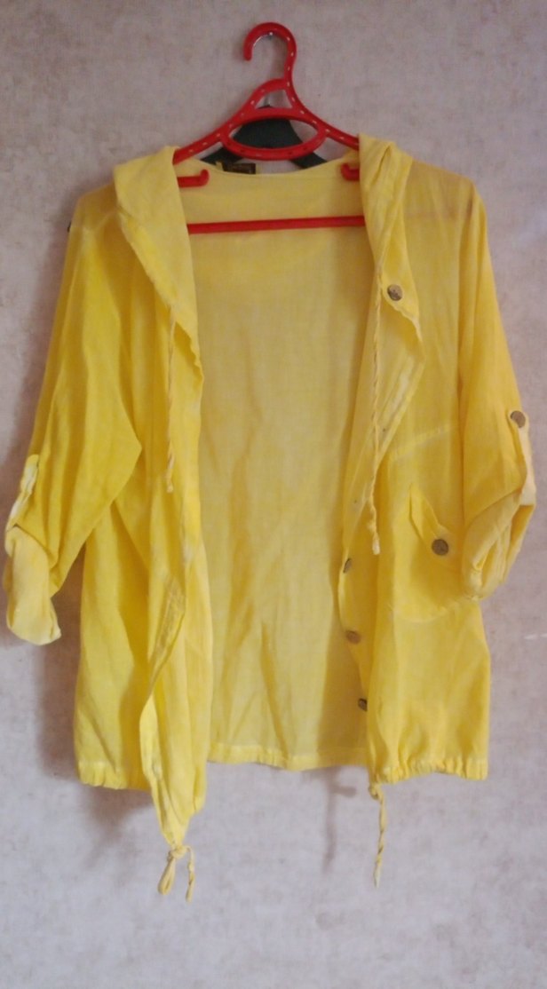 Sarı renkli kadın keten gömlek , düğmeli ve bol kesimdir. Midi boy, uzun kollu ve keten kumaştandır. Notlu yakası ve parlak dokusuyla gündelik kullanıma uygundur. ☔