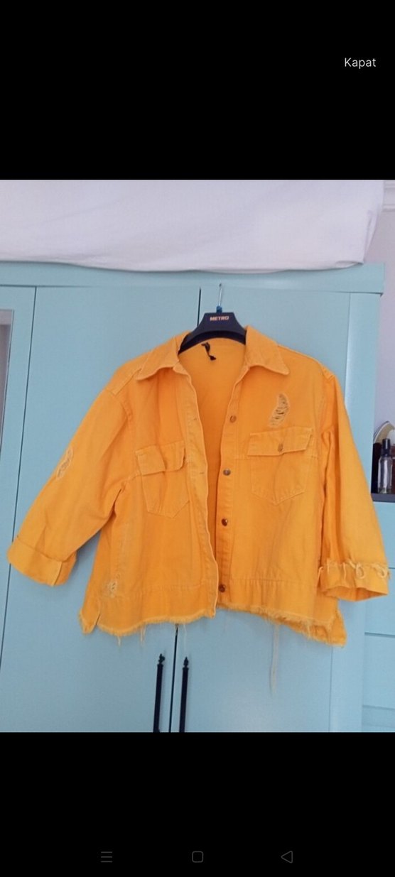 Düğmeli, uzun kollu, kısa kesim sarı kot ceket. Salaş kesimi ve klasik yaka detayıyla günlük kullanıma uygundur.
