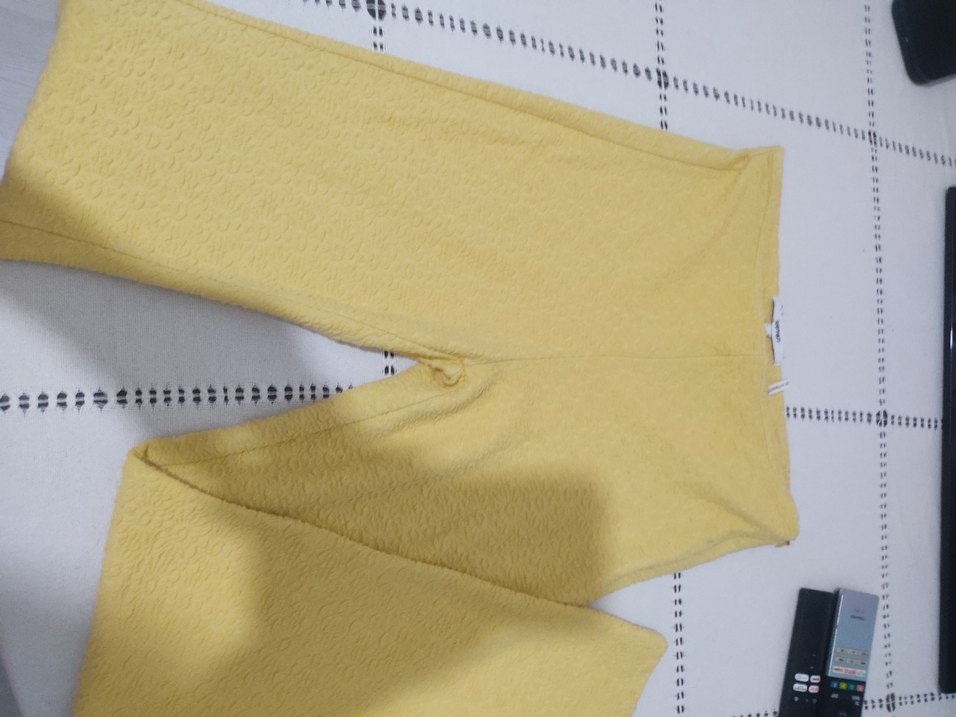 Düğmeli, fitted kesim sarı kumaş pantolon, normal midi boyda, yumuşak ve sıcak dokuda rahat kullanım için uygun. likralı, İspanyol paça