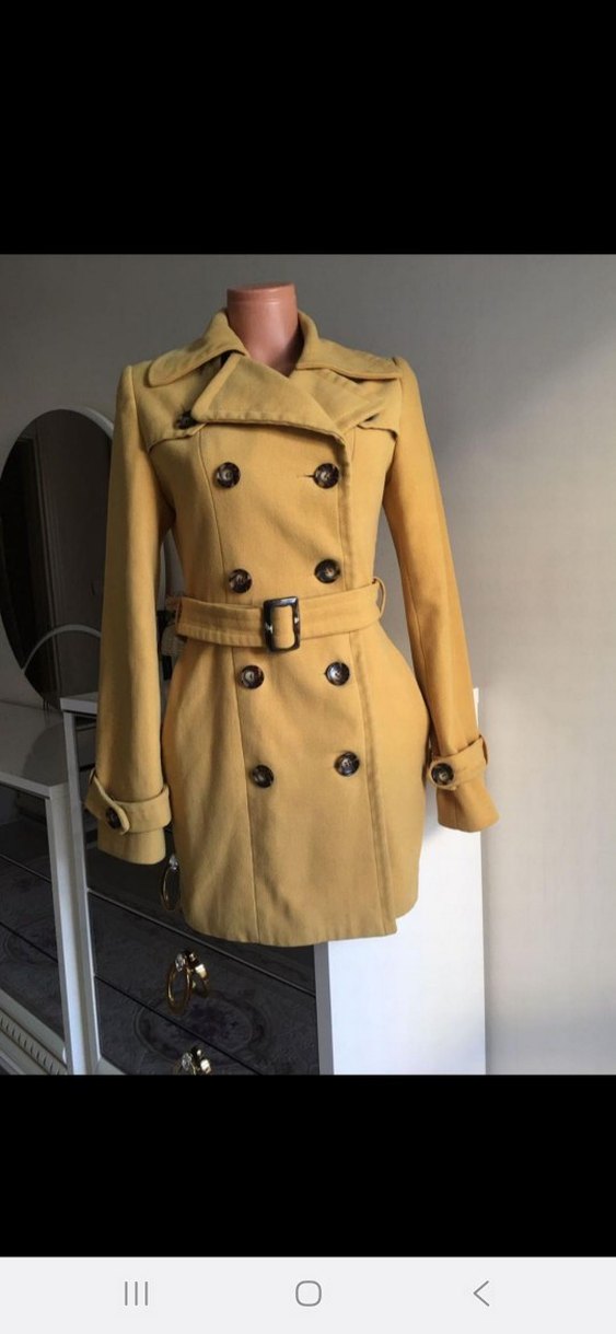 Düğmeli, kemerli ve sarı renkte midi uzunlukta kaşe. Notch yaka ve askı detaylı kollarıyla günlük sokak stiline uygundur. Sorunu yoktur