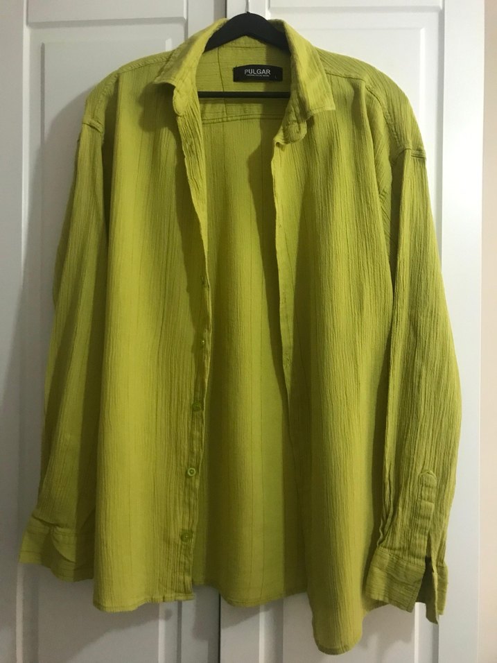 Düğmeli, uzun kollu, keten kumaştan yapılmış sarı kadın gömlek. Normal boyda ve rahat kesimlidir, günlük kullanım için uygundur.