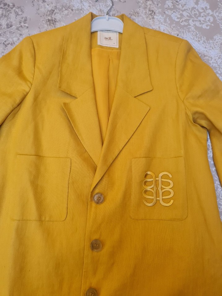 Sarı keten kumaştan yapılmış, düğmeli ve uzun kollu kadın blazer ceket. Cepte nakış detayları ve parlak görünümü ile ofis kullanımı için uygundur.