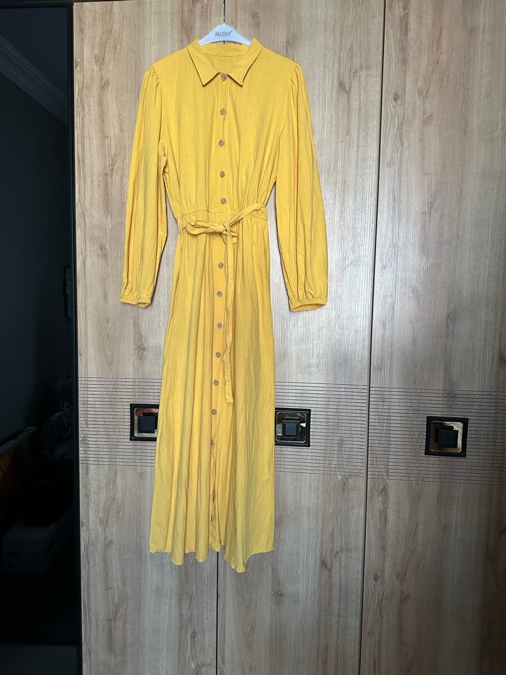 Düğmeli ve uzun kollu, yakalı sarı keten gömlek elbise. Bol kesimli, minimal ve bohem tarzda rahat bir parça.