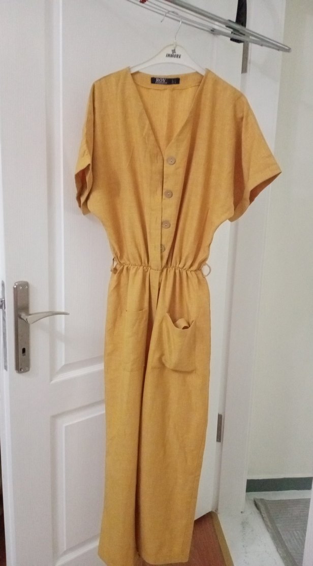 Bol kesim, keten kumaştan yapılmış, düğmeli ve cep detaylı sarı renkli kadın tulumu, kısa kollu ve yakası çıtçıtlıdır.
