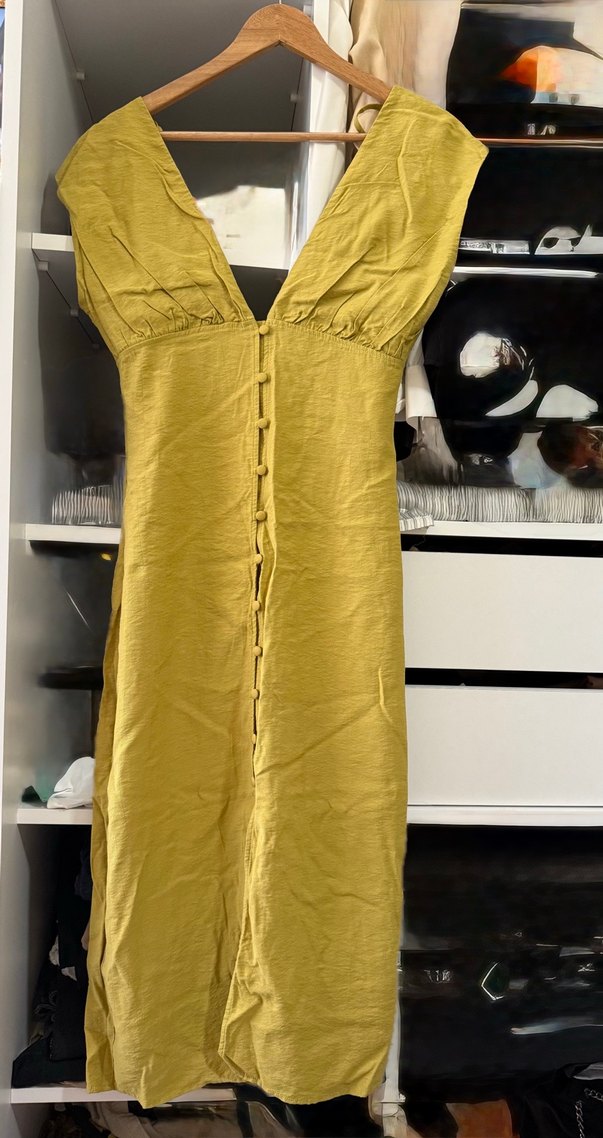 Parlak sarı renkte, V yakalı, düğmeli, keten kumaştan, uzun ve kolsuz, vücuda oturan bohem tarz elbise. Günlük kullanım için uygundur.