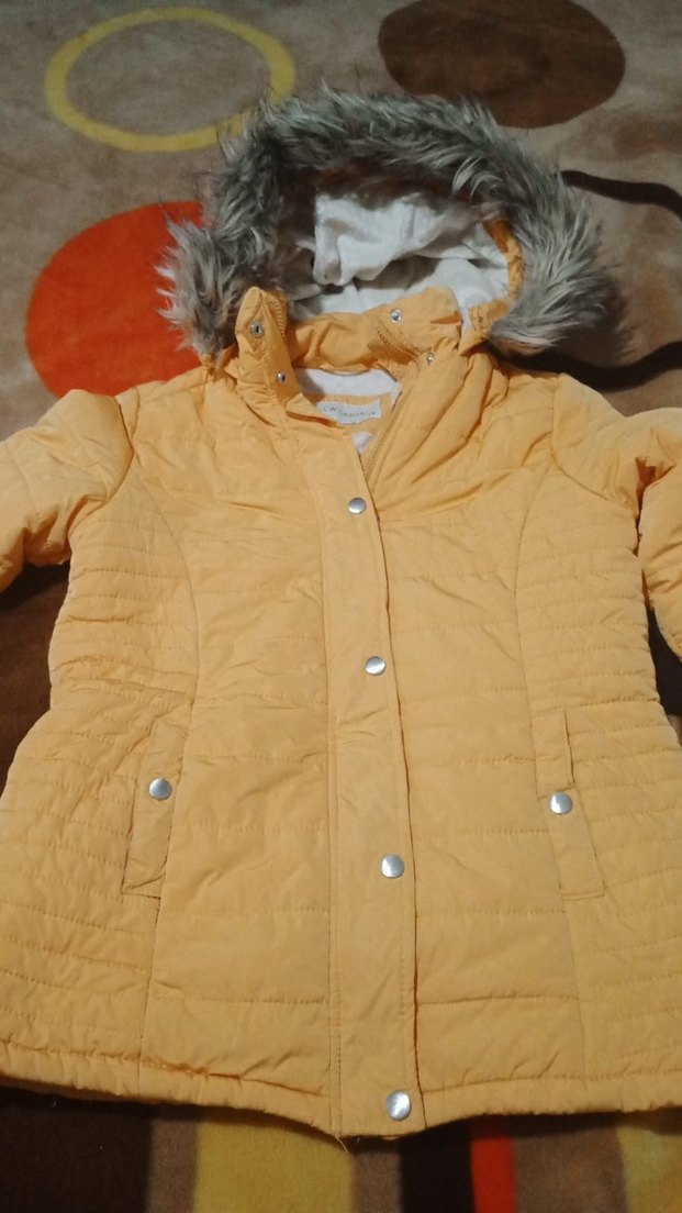 Düğmeli, sarı renkli kışlık mont, yumuşak polar kumaştan yapılmıştır. Parlak görünümlü, uzun kollu ve kürklü kapüşonludur.