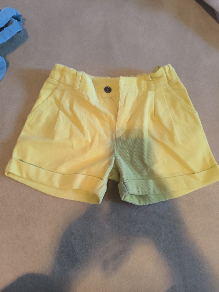 Düğmeli, bol kesim, pastel sarı pamuk kız çocuk şortu. Düz ve desensiz, sokak stiline uygun.