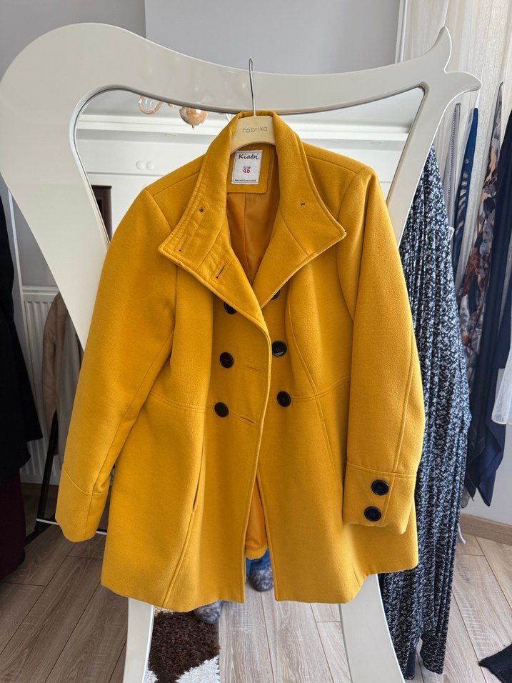 Düğmeli ve kesik yakalı bu sarı kadın kaban, midi boyda ve uzun kolludur. Rahat kesimi ve yumuşak, sıcak dokusu ile günlük sokak stiline uygundur.