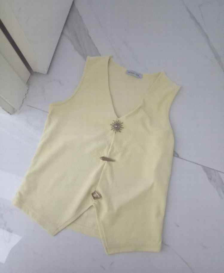 Pastel sarı, düğmeli, askısız yaka, bol kesim, sentetik kumaştan yapılmış kadın yeleği. Günlük rahat kullanım için uygundur.
