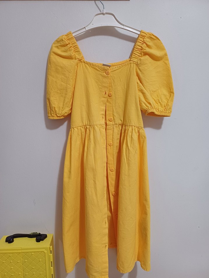 Yumuşak keten kumaştan, düğmeli önü ve kısa balon kollu, salaş kesim sarı midi elbise. Minimalist bohem tarz için tekne yaka detaylı. çocuk elbise