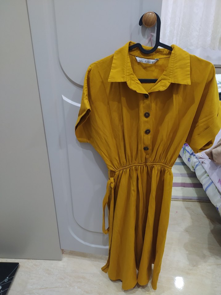 Sarı midi elbise, kısa kollu ve yakalıdır. Düğmeli ön kısmı ve bel bağcığı ile bol kesimdir. Parlak sentetik kumaştan yapılmıştır, rahat sokak stili için uygundur.