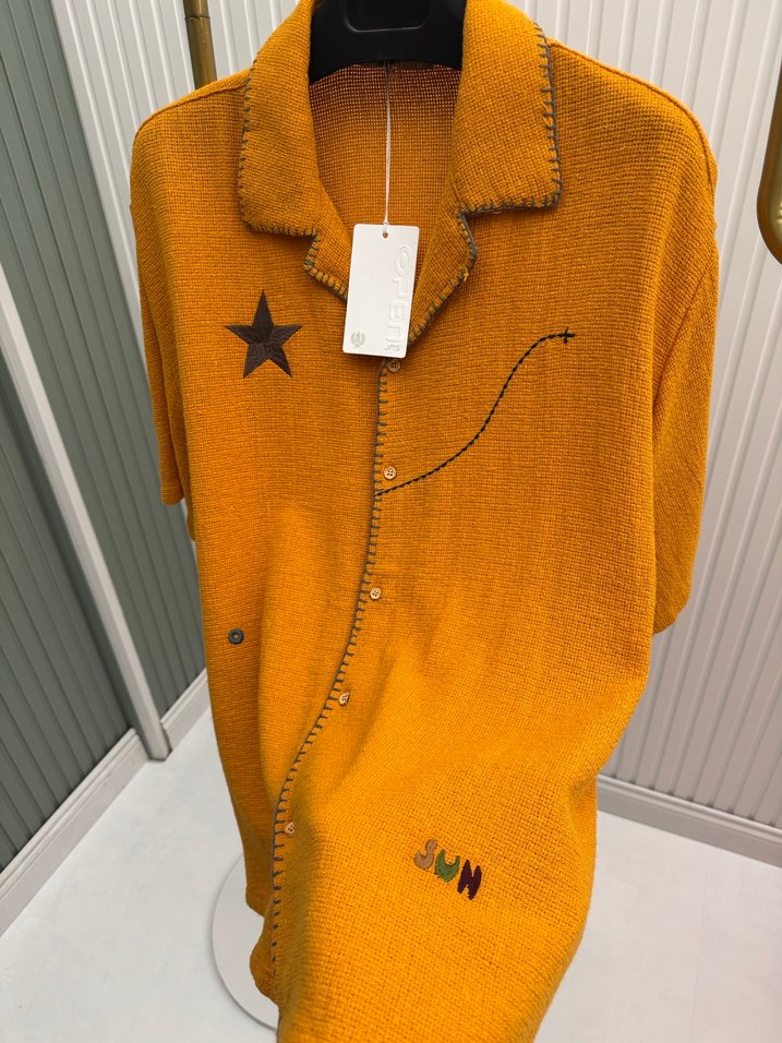 Kısa kollu, düğmeli sarı triko gömlek. Notlu yaka ve nakış detaylarıyla rahat ve trend görünüme uygundur.