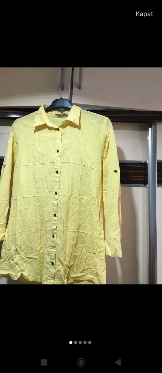 Açık sarı renk, uzun boy keten gömlek. Düğmeli ve yakalı, uzun kollu ve dar kesimlidir. Günlük sokak stili için uygundur.