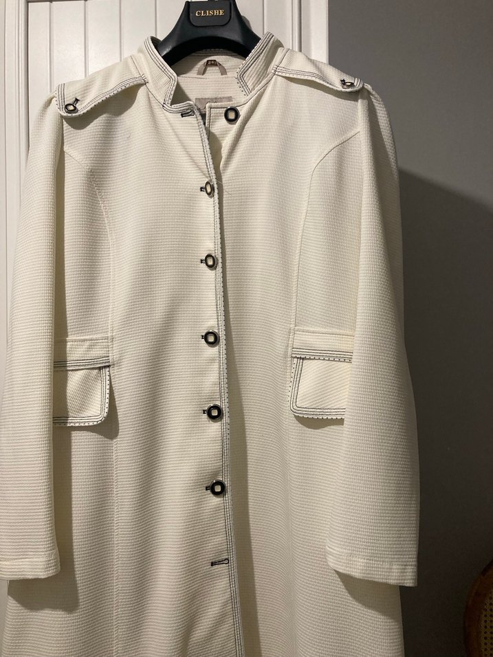 Düğmeli, beyaz midi uzunlukta kadın ceketi. Notlu yaka, uzun kollu ve regular fit. Ofis için klasik şıklık sunar.