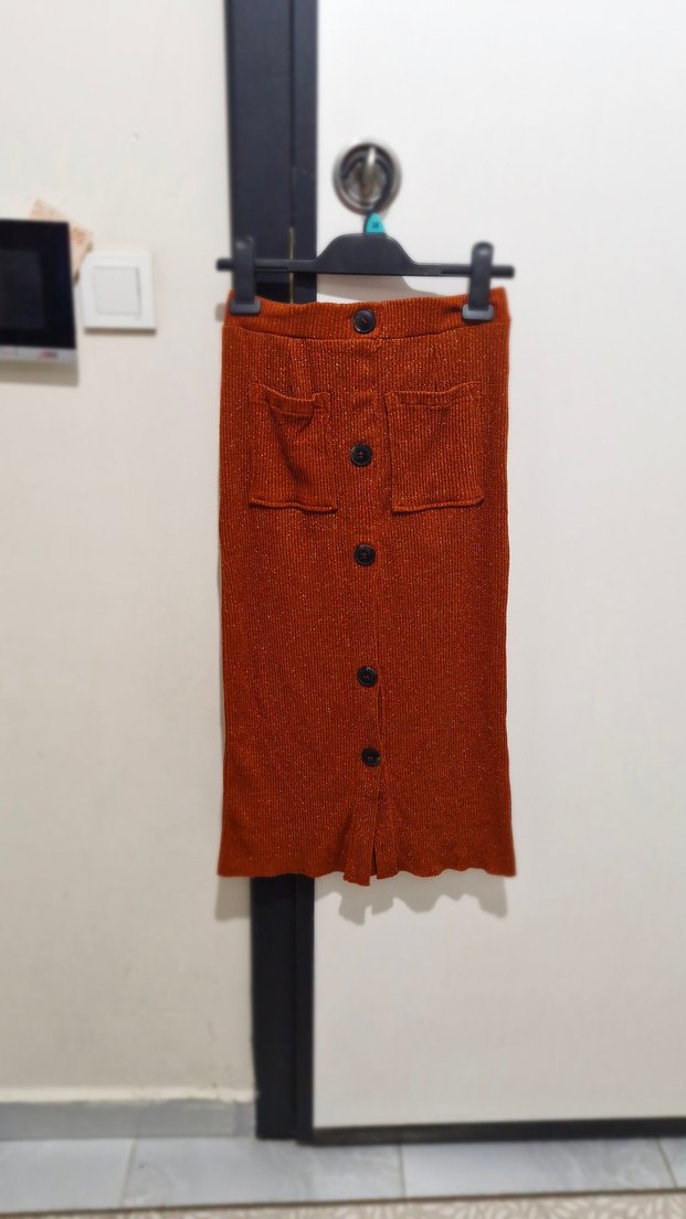 Kahverengi triko midi etek, önden düğmeli ve iki cepli, rahat ve gerçekten şık. Harika ve çok kaliteli bir üründür.Sıfır ayarındadır. Ister günlük ister iş yerinde giymek için kullanabilirsiniz.Vücudu saran ve ince gösteren bir modeli var. Kahverengiden çok kiremit rengine daha yakın.