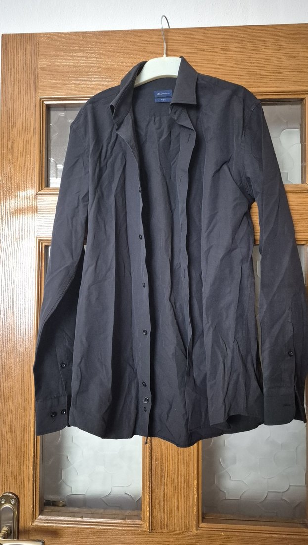 Siyah renkli, uzun kollu erkek gömlek. Düğmeli ve notched lapel yaka tasarımı ile ofis kullanımı için uygundur. Düzenli kesim sunar.