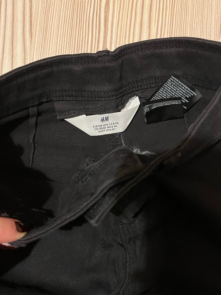 H&M markalı, düğmeli kapamalı, siyah, dar kesim kot pantolon. Midi boy ve günlük sokak stili için uygun.