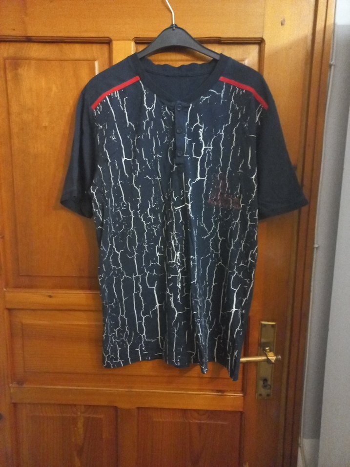 Kısa kollu, bol kesim, bağlama desenli siyah erkek tişörtü, düğmeli ve bisiklet yaka ile sokak modası tarzında.