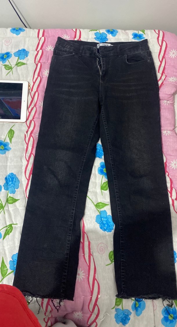 Düğmeli, bağlama desenli siyah kot pantolon, rahat kesimiyle günlük kullanıma uygun şık bir seçimdir.