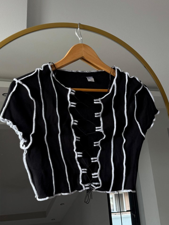 Düğmeli ön kısmı ve bağlamalı askıları olan, tekne yakalı siyah triko bluz. Normal midi boyda, günlük kullanıma uygun.