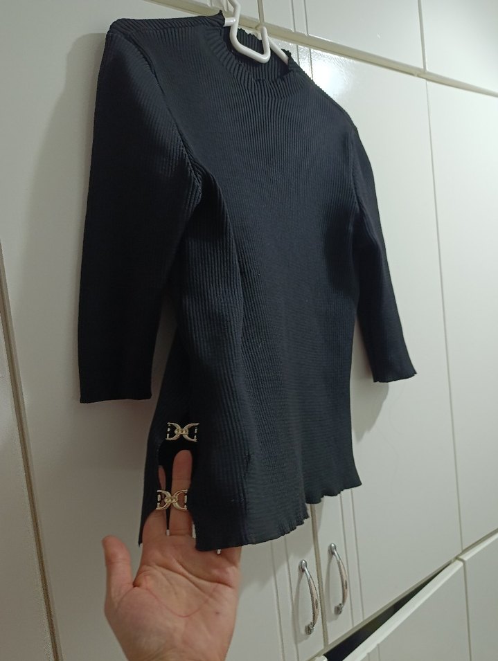 Düğmeli yan detaylı, balıkçı yakalı, uzun kollu, siyah ve dar kesim kadın kazak. Günlük kullanıma uygun, sentetik kumaştan yapılmıştır.