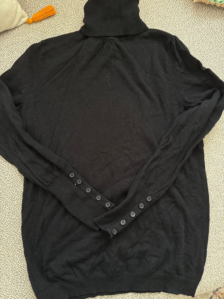 Düğmeli kolları ve balıkçı yakasıyla siyah, ince kesim kadın kazağı. Keten kumaştan, minimalist ve gotik tarzda, günlük kullanıma uygun. Temiz