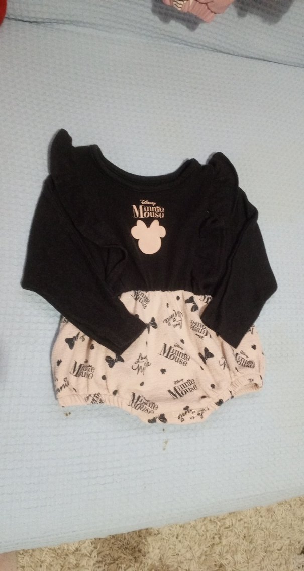 Uzun kollu, düğmeli siyah üst ve Minnie Mouse baskılı alt kısmı olan bebek kız tulumu.