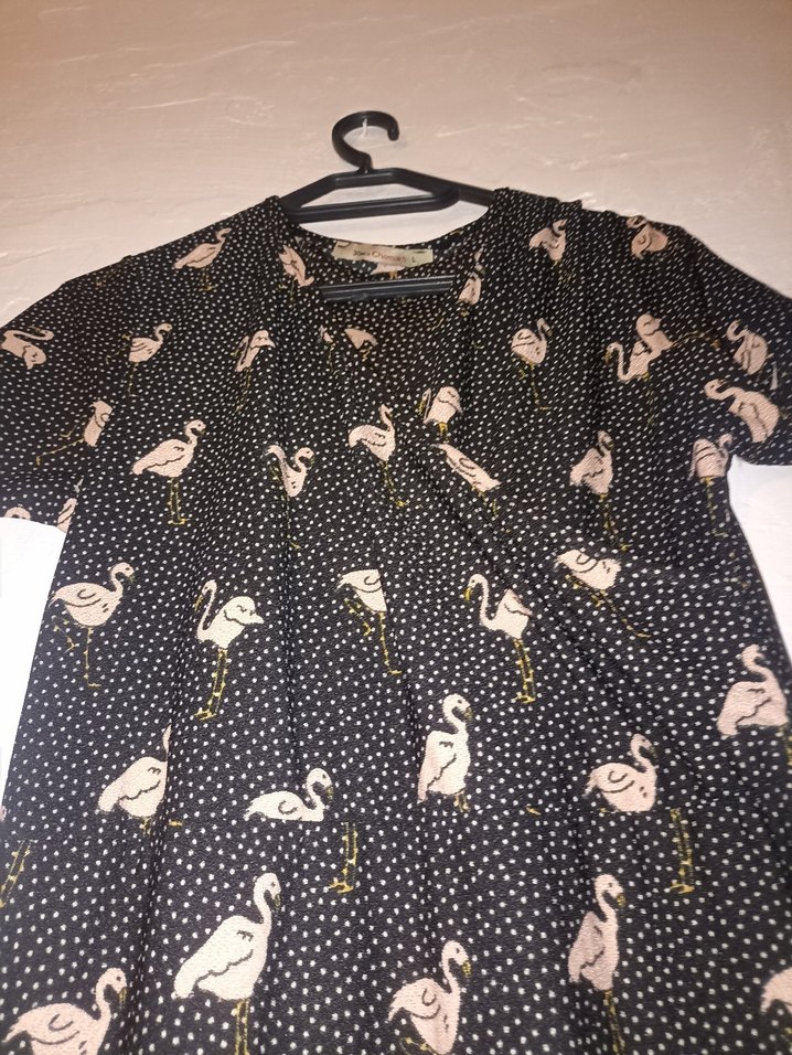 Siyah baskılı hamile bluzu, V yaka, kısa kollu, bol kesim ve uzun boyludur. Düğmeli ve flamingo desenli, günlük kullanıma uygun vintage sokak stili. son fotoğrafta ışıktan dolayı öyle çıkmış elbisenin üzerinde olan bir leke değil