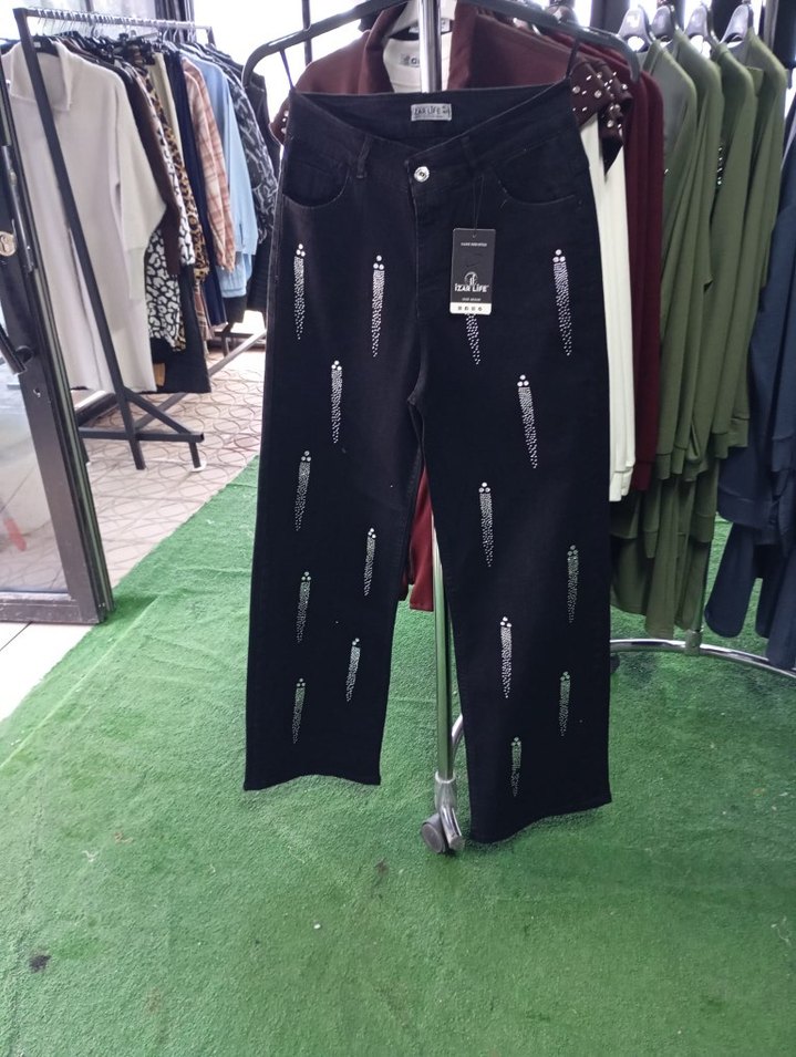 Düğmeli, baskılı siyah denim pantolon, günlük sokak stili için uygun, rahat kesimle tasarlanmıştır. beden seçenekleri mevcut mağaza ürünü