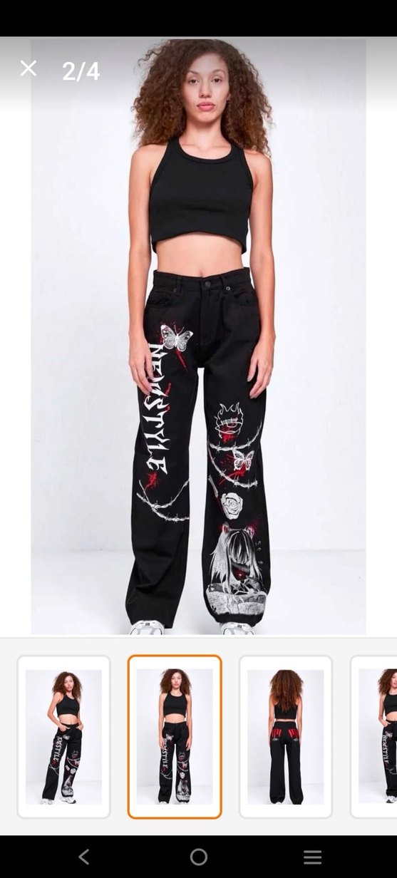 Düğmeli, baskılı grunge punk desenli siyah bol kesim midi uzunlukta kadın denim pantolon, günlük sokak stili için uygun.