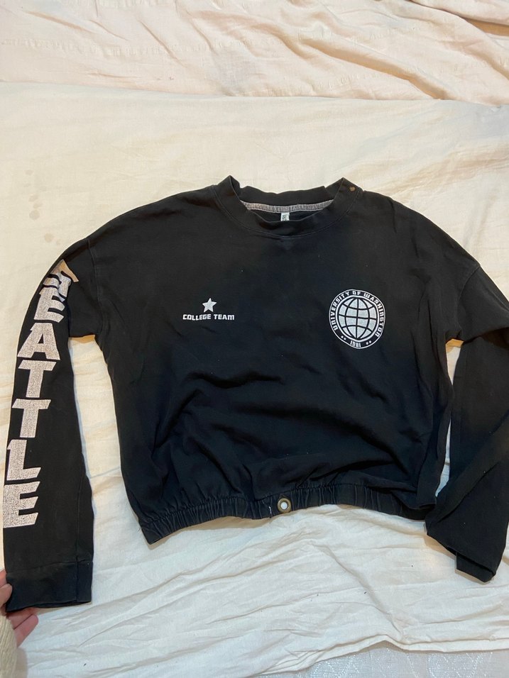 Düğmeli, baskılı detaylara sahip siyah uzun kollu, yuvarlak yaka ve bol kesim kadın sweatshirtü. Yumuşak ve sıcak kumaştan, günlük kullanım için uygundur.