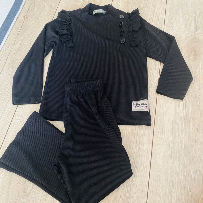 Uzun süre kullanılan ama hala kullanılabilir makul ürünlerdir, makul fiyatla satıştadır. Siyah, bol kesim bebek kız takımı. Uzun kollu, düğmeli ve fırfırlı detaylı, yumuşak ve sıcak kumaştan, bisiklet yaka ile trendy casual tarzda.