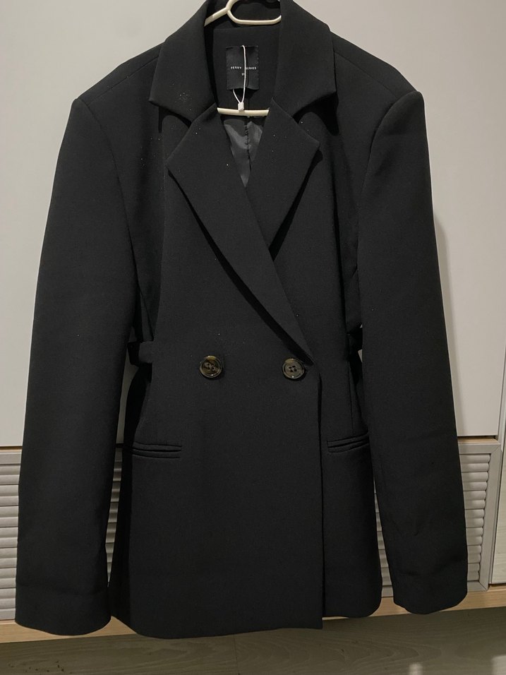 Düğmeli, normal boyda, siyah kadın blazer. Strappy kollu ve yaka detaylı, yumuşak ve sıcak kumaştan üretilmiştir. Ofis kullanımı için uygundur.Vatkaları mevcuttur.