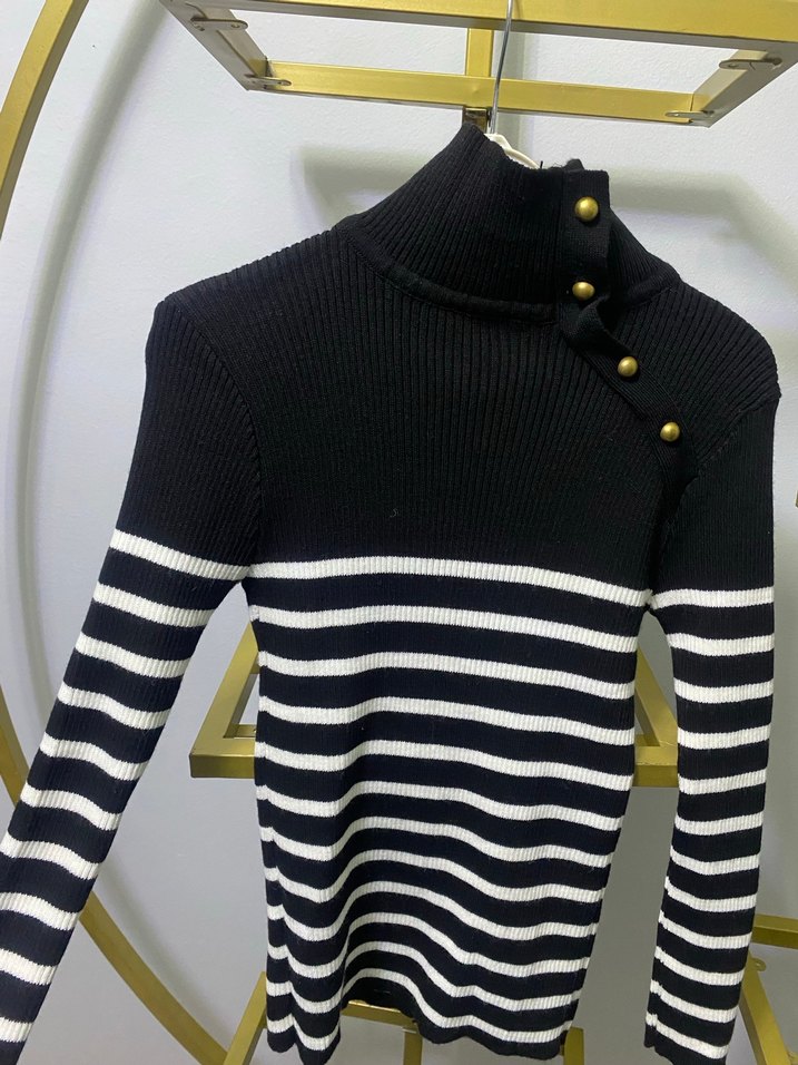Düğmeli boğazlı, siyah beyaz çizgili, fitted kesim örme kazak, günlük kullanıma uygun. Tertemiz kusursuz sayılı giydim .