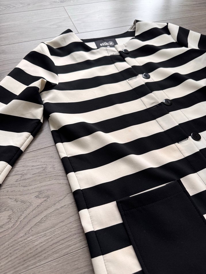 Birkaç defa kullanıldı bir deformesi yoktur. M bedendir. Uzun boy, siyah beyaz çizgili ceketi, düğmeli ön, tekne yaka ve uzun kollu. Pürüzsüz sentetik kumaştan, rahat kesimli, günlük sokak stili için uygun.