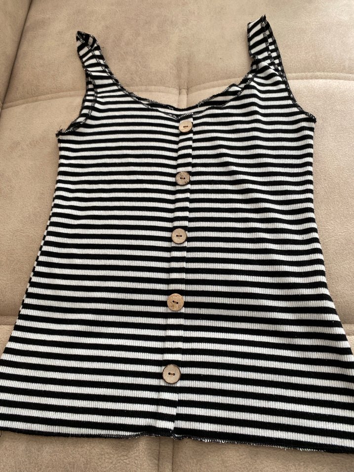 Düğmeli, kayık yaka ve siyah beyaz çizgili, vücuda oturan kolsuz kadın atlet.