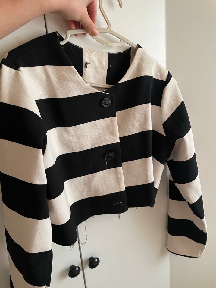 Düğmeli, notalı yaka ve uzun kollu bu kadın ceket, bol kesim ve siyah beyaz çizgili desene sahiptir.Crop boyda, günlük sokak stiline uygun sentetik kumaştan yapılmıştır.
