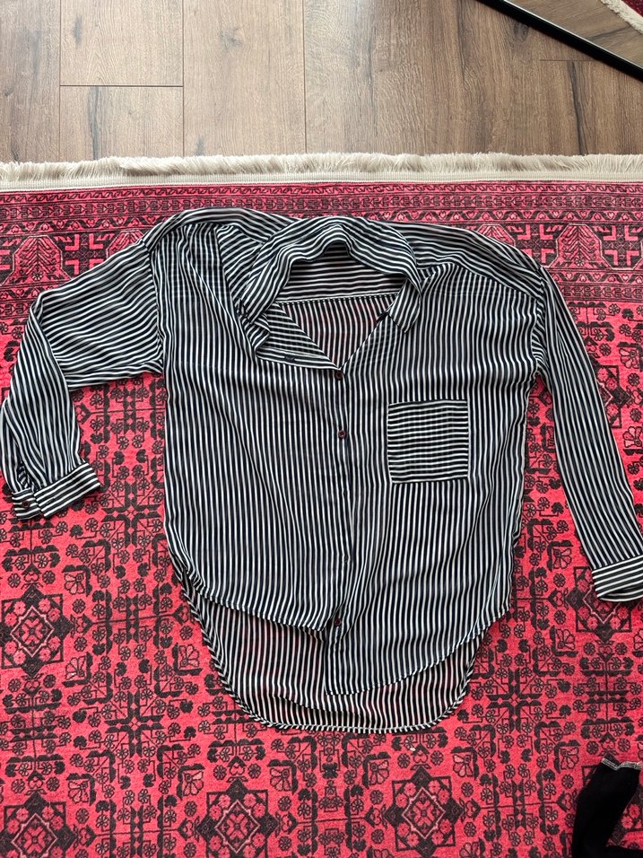 Siyah beyaz çizgili, düğmeli ve kayık yaka detaylı, bol kesim uzun kollu kadın gömleği. Sentetik kumaştan, günlük sokak stiline uygun.