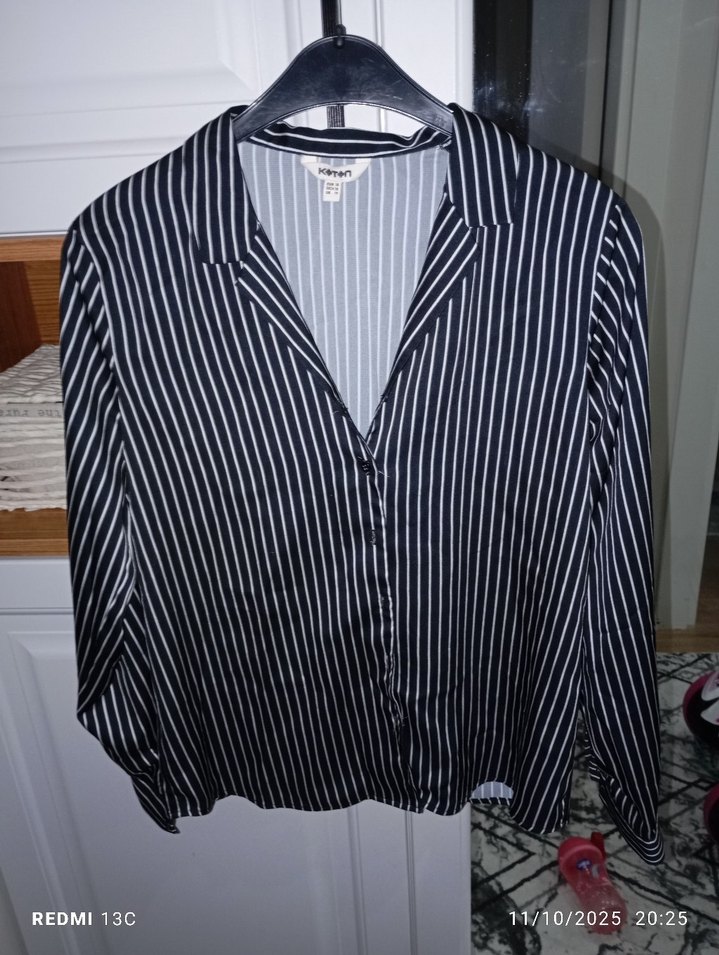 Uzun kollu, düğmeli ve yakalı kadın gömleği. Siyah-beyaz çizgili, ipeksi dokulu, rahat kesim ve midi boyda, ofis veya günlük kullanım için uygun.