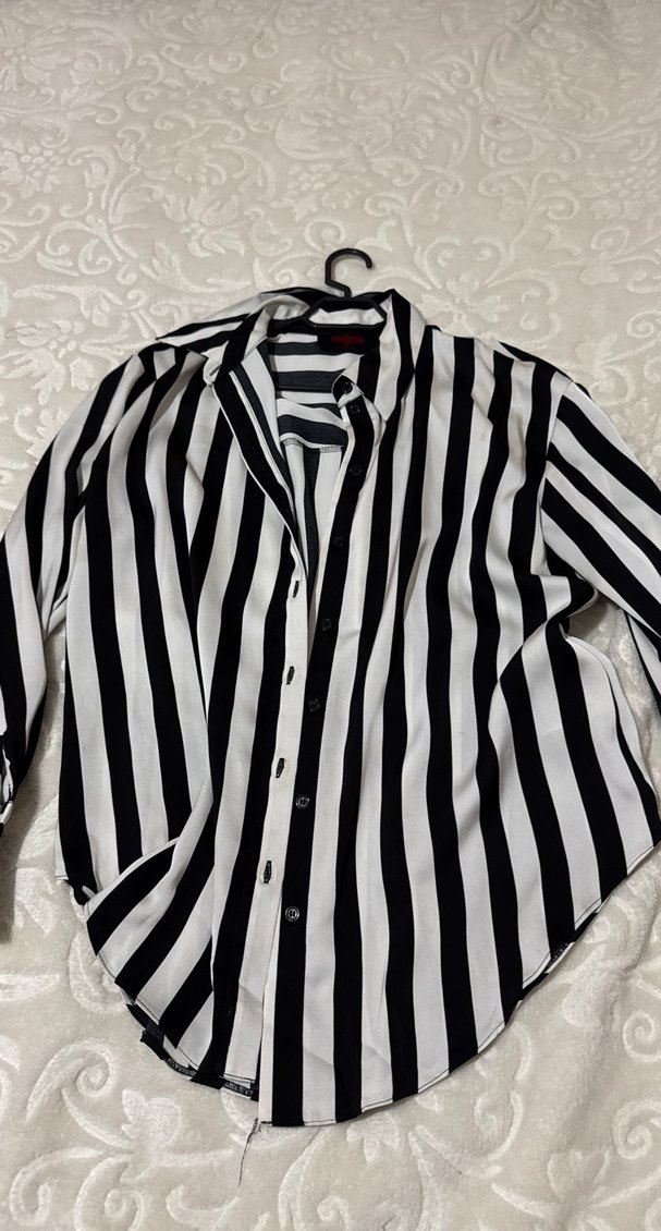Düğmeli Siyah Beyaz Çizgili Kadın Gömlek