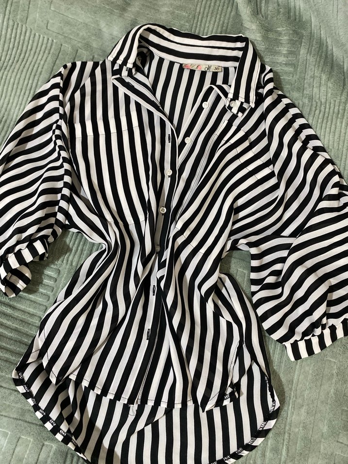Düğmeli, uzun kollu, siyah beyaz çizgili, salaş kesim kadın gömleği. Teknolojik kumaş, tekne yaka ve normal uzunlukta, günlük kullanım için uygun. Balon kollu
