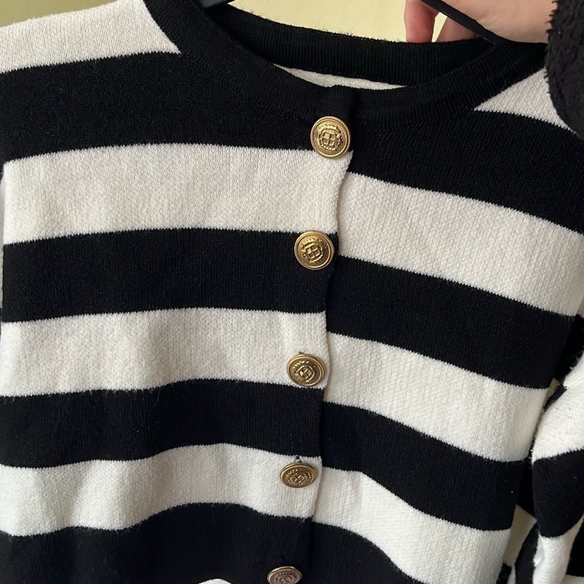 Düğmeli Siyah Beyaz Çizgili Kadın Hırka