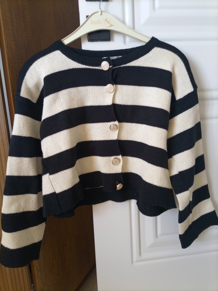 Uzun kollu, yuvarlak yakalı ve düğmeli kadın hırka. Siyah beyaz yatay çizgili, rahat kesim ve örme kumaştan yapılmıştır. Günlük kullanım için uygundur.