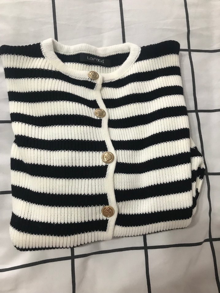 Düğmeli Siyah Beyaz Çizgili Kadın Hırka