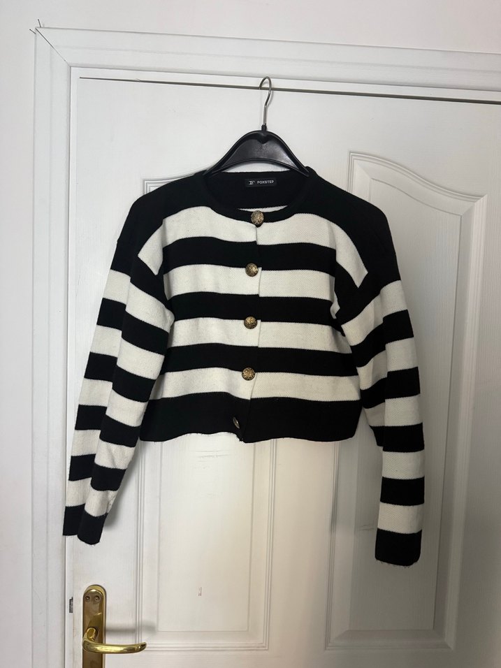 Düğmeli Siyah Beyaz Çizgili Kadın kışlık Hırka