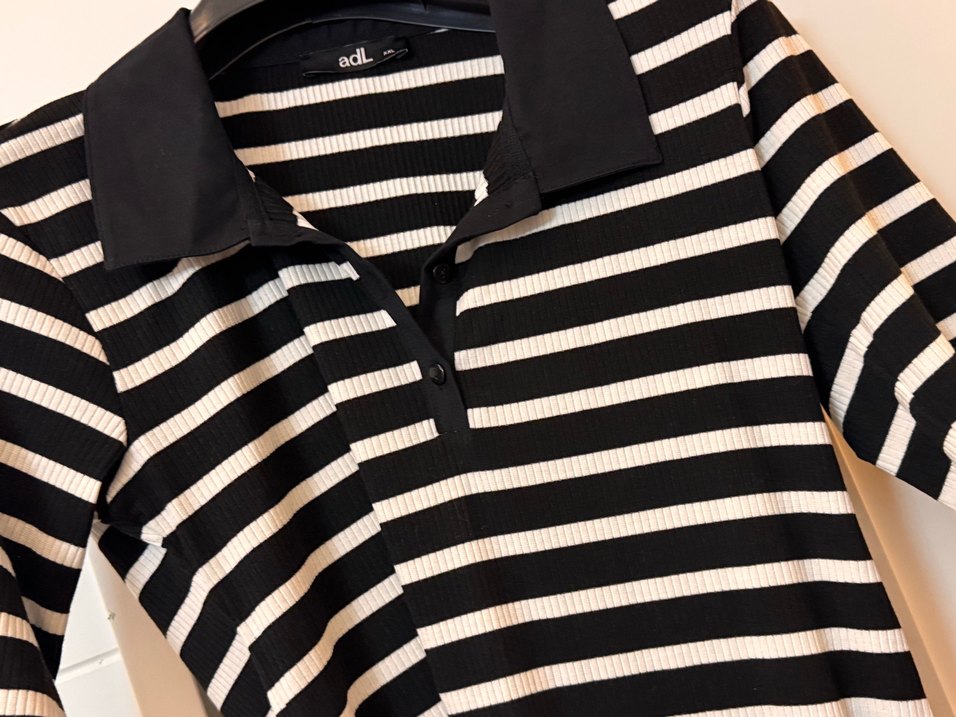 Pamuklu, siyah beyaz çizgili, düğmeli, kısa kollu ve kayık yaka kadın triko. Rahat ve şık günlük sokak stili için uygundur. (xxl yazıyor fakat kalıpları dar m beden gibidir)